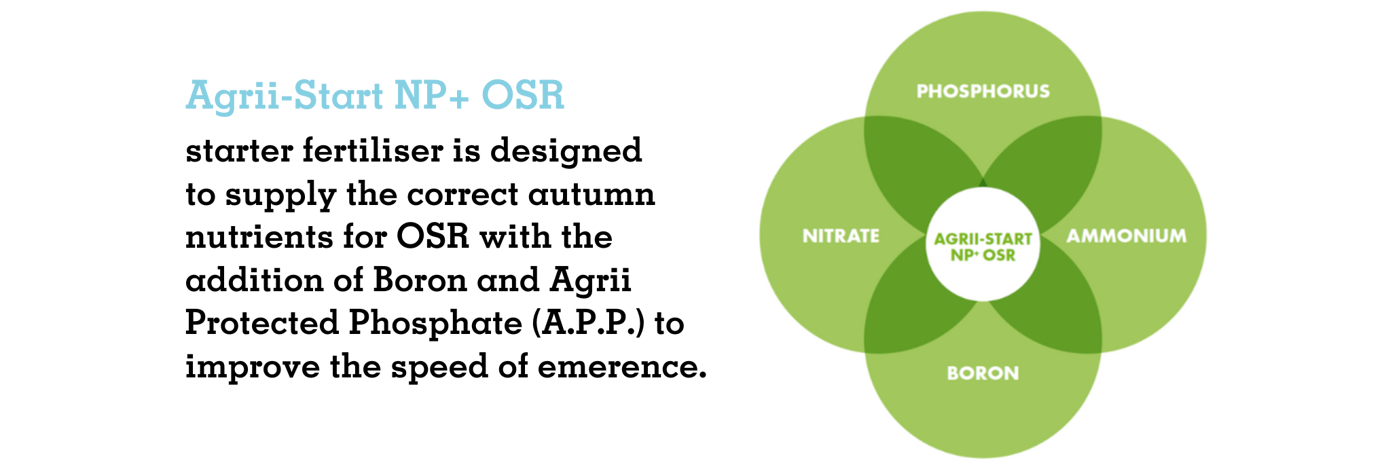 - Agronomically correct – the starter fertiliser is designed to supply the correct autumn nutrients for OSR with the addition of Boron and Agrii Protected Phosphate (A.P.P.) to improve speed of emergence.