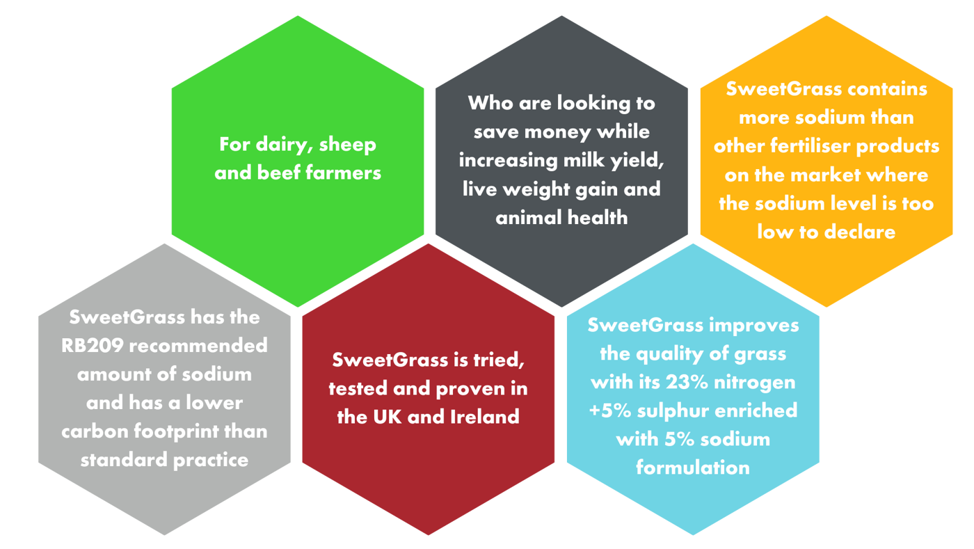 SweetGrass is a range of grassland fertilisers containing sodium, specifically designed to increase animal performance from grass.