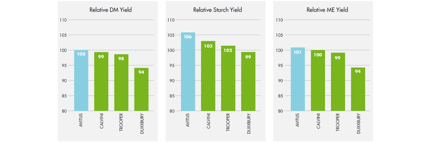 Avitus continues to break the mould for high yielding and early maturing material. Regularly achieving fresh weight yields in excess of 50t/ha across varying sites, Avitus produces an unrivalled combination of DM, starch and ME.